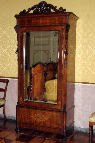 Armadio con piedi anteriori a cipolla, casseto basso, anta unica con specchiera con bordi molati, cappello sormontato da fastigio intagliato con due volute e conchiglia al centro. Sul cappello, ai 4 angoli dell'anta e sul cassetto: motivi decorativi intarsiati a volute e racemi. Lungo gli spigoli laterali: in alto ghirlande di frutta scolpita a rilievo e in basso motivi decorativi torniti con ghianda terminale.