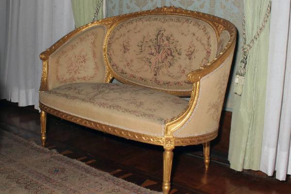 Divanetto con esili gambe anteriori tornite, scanalate e con rosetta inscritta in un quadrato. Un motivo decorativo a nastro corre lungo lo schienale e sulla parte anteriore del telaio della seduta, mentre fiori e motivi fitomorfi si rilevano all'apice dello schienale. E' rivestito con un tessuto a fiori e con scena di genere con dame al centro.