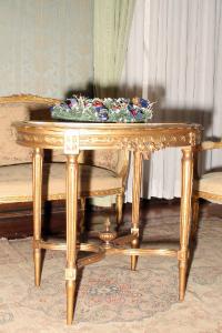 Tavolino con esili gambe anteriori tornite, scanalate e con rosette inscritte in un quadrato; le gambe sono raccordate da due fasce semicircolari scanalate con al centro un'anfora a tutto tondo. Un motivo decorativo a nastro corre lungo il bordo ovale del piano d'appoggio, intervallato da fiori e motivi fitomorfi. Piano in marmo.