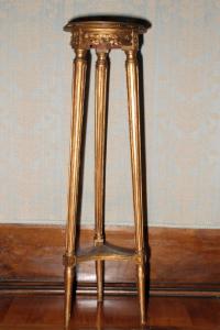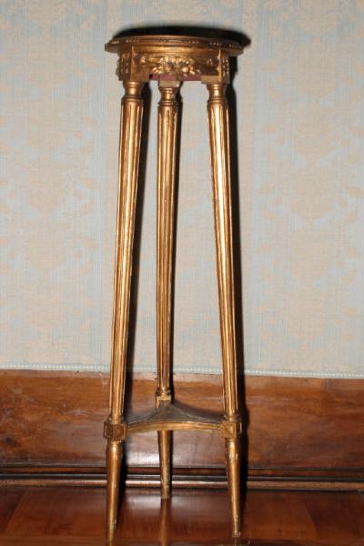 Trepiedi portavaso con esili gambe anteriori tornite, scanalate e con motivo a punta di diamante inscritto in un quadrato nella parta bassa e motivo a rosetta entro un quadrato nella porzione alta. Le tre gambe sono raccordate tra loro da un piccolo piano triangolare. Un motivo decorativo a fiori e racemi e una fascia a perle e fusaroli, corrono lungo il bordo del piano d'appoggio.