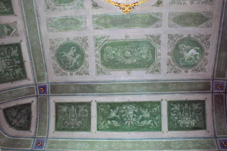 Volta affrescata a monocromo verde, con decori in verde chiaro e bianco entro riquadri a fingere degli stucchi: cetre, cesti di frutta, grifoni, 4 centauri (2 uomini e 2 donne). Negli angoli piccoli riquadri azzurri con rosette in stucco dorato. Al centro decorazione policroma, tableau: con clipeo con 6 putti, ghirlande di fiori e canestro di frutta entro bordo rilevato in stucco dorato.