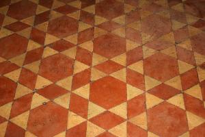 Pavimento in cotto bicolore (rosso e crema) con motivo a stella a sei punte (creata da sei triangoli chiari color crema), una piastrella esagonale rossa al centro e sei romboidali rosse intorno.