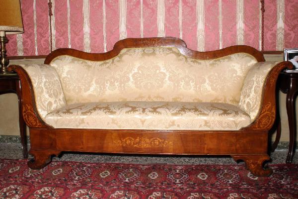 Divano a barchettone imbottito con tessuto a fiori damascato color giallo chiaro, schienale sagomato, piedi a voluta e motivi decorativi fitomorfi a intarsio in legno chiaro.