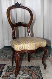 Seggiolina con la sola seduta imbottita in tessuto a fiori damascato e schienale in legno con cartiglio a croci e volute all'apice, esili gambe mosse.
