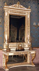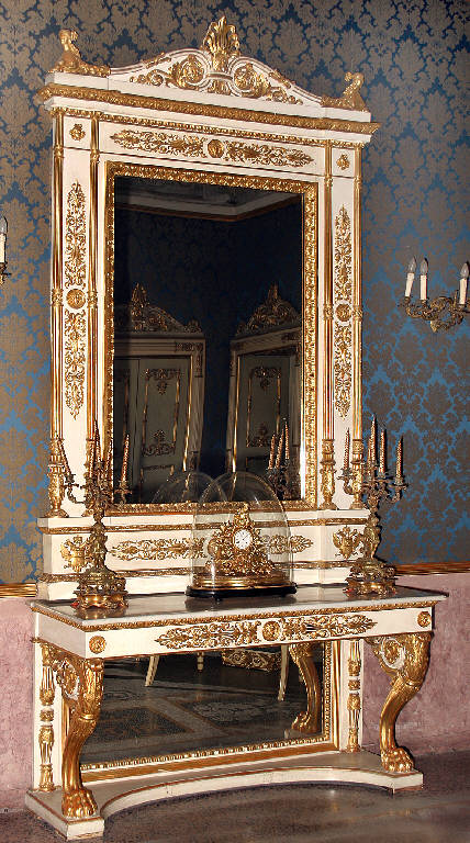 Consolle con specchiera di legno verniciato a pastello conn elegante intagliatura dorata, piano in marmo bianco, alti piedi leonini sagomati e specchio rettangolare anche nella base. Motivi decorativi a palmette al centro, clipeo con mascherone e ai lati clipei con due teste leonine.\nLa specchiera reca nella base, ai due lati, due aquile bicefale con corona e scudo con stemma della famiglia Malaspina. Culmina in un fastigio con palmette, volute e due sfingi.