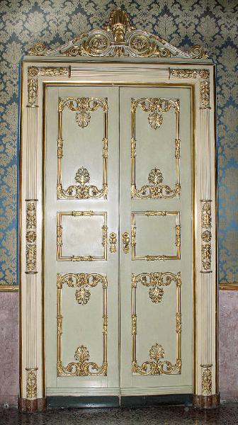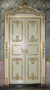 Porta dipinta di bianco con tre specchiature lisce sovrapposte, sottolineate da cornici dorate con palmette, volute e motivi fitomorfi. Il fastigio riccamente decorato, reca volute, girali e palmetta centrale. \nLe sei porte, presentano verso l'interno del salotto dodici maniglie rotonde con ghirlanda di fiori recante al centro una farfalla ad ali spiegate, su ciascuno dei due battenti.\n\n\n\n\n\n\n\n\n\n\n\n\n\n\n\n\n\n\n\n\n\n\n\n\n\n\n\n\n\n\n. La formella esagonale centrale presenta agli angoli 4 triangoli con motivi a foglia dorata. L'architrave lisci sorregge un cappello aggettante. Maniglia ovale in ottone dorato con due palmette, corone e iniziali LM (Luigi Malaspina); due teste leonine e palmette sulla placchetta del buco della serratura.