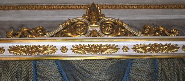 Riloga di tenda con palmette, volute, rosette e motivi fitomorfi, coronata da una ulteriore decorazione apicale a a girali e palmetta.