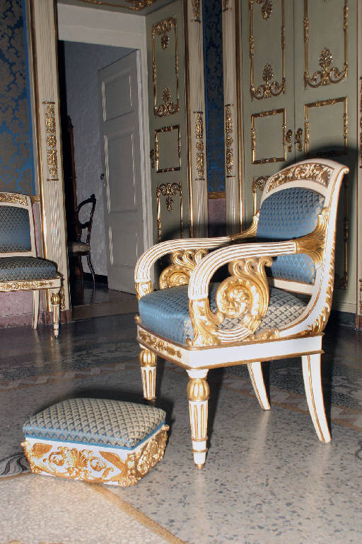 Poltroncina con braccioli a volute, in legno a pastello bianco intagliato e dorato, con imbottitura in seta blu e oro. Motivi decorativi dorati a palmette, volute e racemi