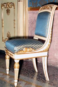 Seggiolina in legno a pastello bianco intagliato e dorato, con imbottitura in seta blu e oro. Motivi decorativi dorati a palmette, volute e racemi