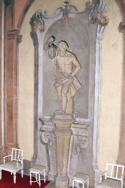 Sulla parete breve est dello scalone d'onore, si apre una nicchia circondata da cornice trompe l'oeil a finto marmo che ospita la statua di Diogene a gambe e torso nudi, con la spalla destra e i fianchi avvolti in un drappo. Nella destra Diogene regge una lanterna in ferro battuto e vetro.