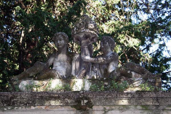 Il muro di cinta del giardino, in muratura piena e lavorato a bugnato, è decorato da due gruppi scultorei a tuttotondo con due putti semisdraiati sul muro con al centro una cornucopia piena di frutti e fiori.