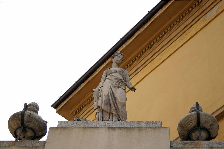 Statua con figura femminile a tuttotondo, allegoria della Poesia, compresa tra due vasi con fiamma, poggianti su trepiedi, a coronamento della cortina muraria dell'ingresso monumentale a destra.