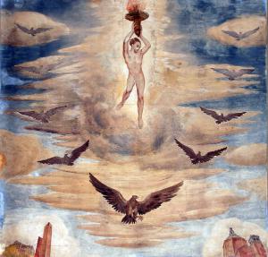 Figura maschile nuda recante una fiaccola, stagliata su un cielo con nubi, intorno nove aquile; in basso a destra il Duomo e la Torre Civica, a sinistra San Michele e le torri medioevali.