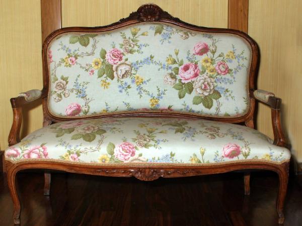 Divanetto con motivo centrale a conchiglia, con fiori, racemi, volute e rivestimento a fiori su fondo azzurro.