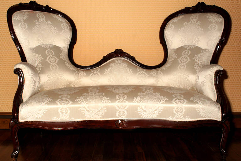Divanetto con doppio schienale, con motivi a cartiglii, volute e perle; rivestimento in seta bianca damasacata.