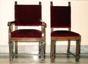 Una poltrona e due sedie con imbottitura in velluto liscio rosso, piedi anteriori a forma di pilastrini scanalati e terminazione a capitelli ionici, schienale imbottito con motivo a fiamma/foglia alle due estremità. La poltroncina presenta braccioli a voluta.