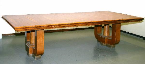 Tavolo Decò con gambe a lira e colonna centrale rastremata verso l'alto.
