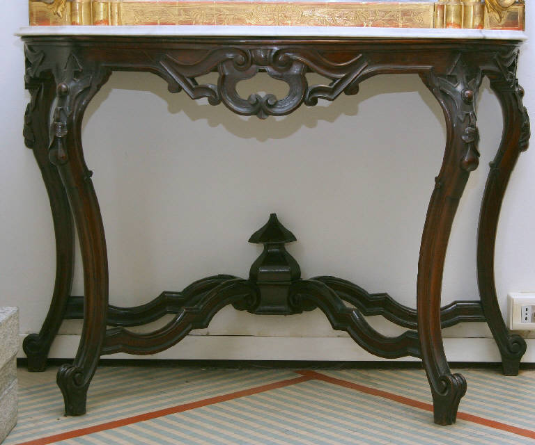 Console su esili gambe sagomate, pigna centrale, piedini a voluta, motivo a cartiglio con perla e pere con foglie nella porzione alta delle gambe, piano in marmo sagomato con finitura a becco d'anatra