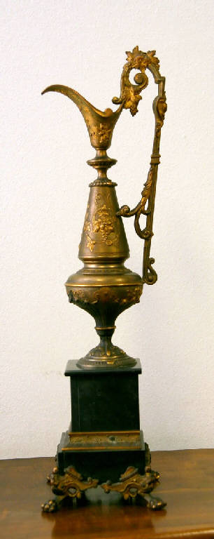 Anforetta decorativa con ghirlande, volute e tralci di vite in ottone dorato, su base in marmo nero con piedi leonini dorati