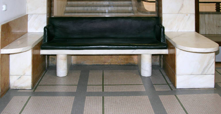 L'atrio è arredato con due panchette in marmo bianco, rivestite da sedili in simil-pelle e affiancate da tavolini a penisola con piano arrotondato, sempre in marmo bianco e laterali in marmo screziato giallo-rosso.