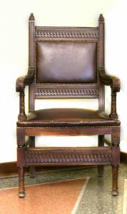 L'insieme è costituito da un seggiolone imbottito in pelle con borchiette e da due poltroncine imbottite in seta blu e profilate con passamaneria. Tutti sono caratterizzati da braccioli a volute, motivo a intreccio, gambe a colonnina e motivo a cuspide apicale. Fanno parte dell'arredo dell'intera stanza che comprende anche un tavolo, una scrivania, un divanetto, due seggioline, una libreria, un'etagere e due armadi: su tutti ricorrono gli stessi motivi decorativi.