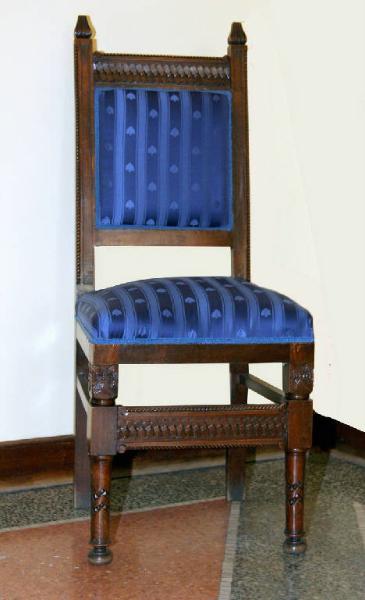 Si tratta di due seggiole imbottite in seta blu e profilate con passamaneria. Sono caratterizzate da motivo a intreccio, gambe anteriori a colonnina con capitello liberty e motivo a due cuspidi apicali. Fanno parte dell'arredo dell'intera stanza che comprende anche un tavolo, una scrivania, un divanetto, un seggiolone e due poltroncine, una libreria, un'etagere e due armadi: su tutti ricorrono gli stessi motivi decorativi.