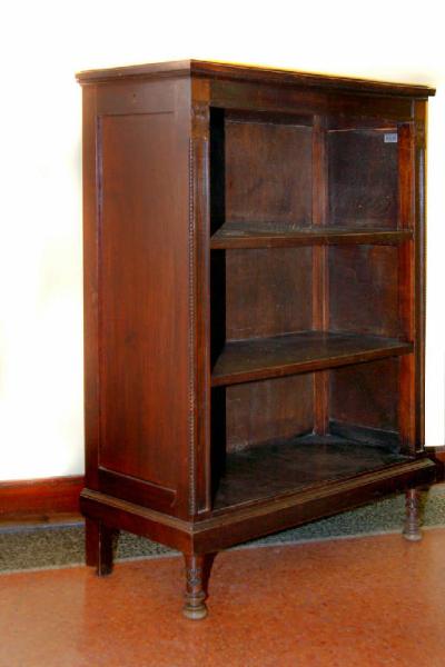 Si tratta di una libreria a tre ripiani, con piedini torniti e decorati da un motivo a intaglio a denti di sega, lesene con palmette apicali e cornicetta a torciglioni. Fa parte dell'arredo dell'intera stanza che comprende anche un tavolo, una scrivania, un divanetto, un seggiolone e due poltroncine, due seggiole, un'etagere e due armadi: su tutti ricorrono gli stessi motivi decorativi.