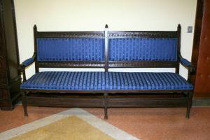 Si tratta di un divanetto imbottito in seta blu e profilato con passamaneria. E' caratterizzato da motivo a intreccio, gambe anteriori a colonnina e motivo a cuspidi apicali. Fa parte dell'arredo dell'intera stanza che comprende anche un tavolo, una scrivania, due seggiole, un seggiolone e due poltroncine, una libreria, un'etagere e due armadi: su tutti ricorrono gli stessi motivi decorativi.