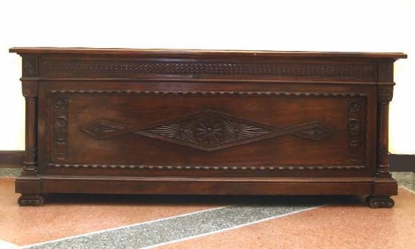 La scrivania presenta un ripiano di cristallo nero. Frontalmente è caratterizzata da un motivo a losanga con fiori, compreso tra vasi con volute e colonnine angolari. La parte alta reca un motivo ad intreccio con due fiori laterali. Internamente presenta due antine con gli stessi motivi che caratterizzano il fronte, in legno scolpito, con due maniglie in ottone. Fa parte dell'arredo dell'intera stanza che comprende anche un tavolo, un divanetto, due seggiole, un seggiolone e due poltroncine, una libreria, un'etagere e due armadi: su tutti ricorrono gli stessi motivi decorativi.