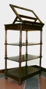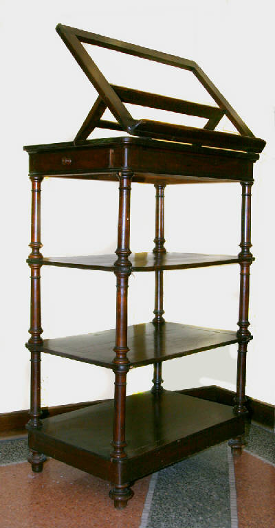 Si tratta di una piccola libreria a tre ripiani, con piedi a cipolla, colonnine e due cassettini con pomoli (di cui uno perso), caratterizzata da un leggio reclinabile.\nFa parte dell'arredo dell'intera stanza che comprende anche un tavolo, una scrivania, un divanetto, un seggiolone e due poltroncine, due seggiole, una libreria e due armadi: su tutti ricorrono gli stessi motivi decorativi.