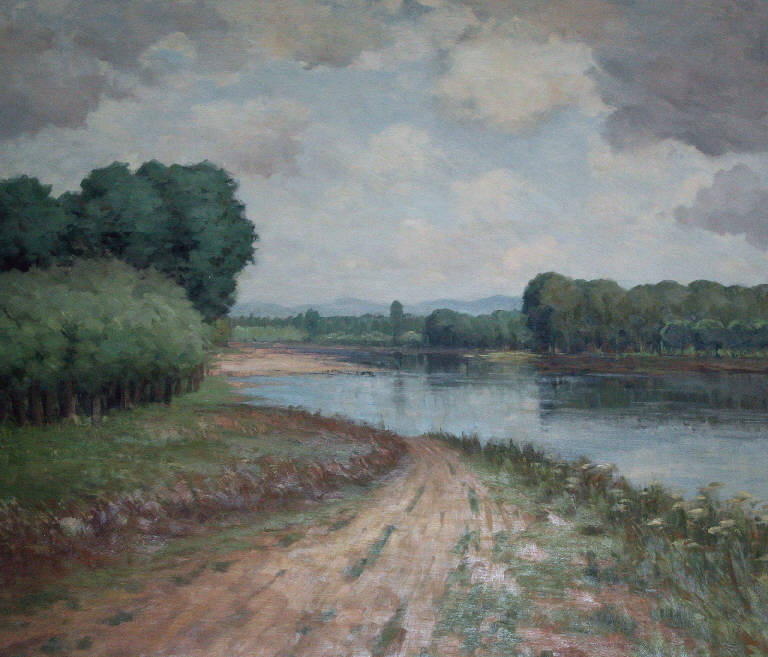 - NOTIZIE STORICO CRITICHE Il dipinto fa parte di un insieme di sei tele (tutte con scorci di Pavia e Provincia), racchiuse entro una sottile cornice in legno dorato, inserite in una cornice in marmo rosa. Le sei tele costituiscono le sovrapporte che decorano altrettante porte in legno (che si aprono nello stesso ufficio), a listelli orizzonatli in radica, con stipiti e architrave in marmo rosso. \nL'apparato decorativo della stanza, oltre alle porte con cornici marmoree e alle sovrapporte, comprende otto stemmi dipinti sul soffitto e una zoccolatura con rivestimento marmoreo, con lastre di marmo rosso in rilievo sul fondo rosa, a creare una specie di decoro a bugnato e un pavimento a mosaico geometrico. L'insieme si può far risalire alla progettazione degli anni Trenta del Novecento dell'arch. Carlo Morandotti, molto attento alla cura degli interni e non solo alla distribuzione funzionale degli spazi e all'organizzazione formale dei prospetti.