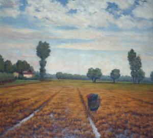 Veduta di una risaia con una mondina in primo piano e alberi e una cascina sullo sfondo.