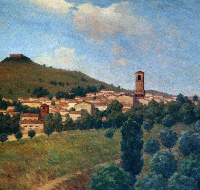 - NOTIZIE STORICO CRITICHE Il dipinto fa parte di un insieme di sei tele (tutte con scorci di Pavia e Provincia), racchiuse entro una sottile cornice in legno dorato, inserite in una cornice in marmo rosa. Le sei tele costituiscono le sovrapporte che decorano altrettante porte in legno (che si aprono nello stesso ufficio), a listelli orizzonatli in radica, con stipiti e architrave in marmo rosso. \nL'apparato decorativo della stanza, oltre alle porte con cornici marmoree e alle sovrapporte, comprende otto stemmi dipinti sul soffitto e una zoccolatura con rivestimento marmoreo, con lastre di marmo rosso in rilievo sul fondo rosa, a creare una specie di decoro a bugnato e un pavimento a mosaico geometrico. L'insieme si può far risalire alla progettazione degli anni Trenta del Novecento dell'arch. Carlo Morandotti, molto attento alla cura degli interni e non solo alla distribuzione funzionale degli spazi e all'organizzazione formale dei prospetti.