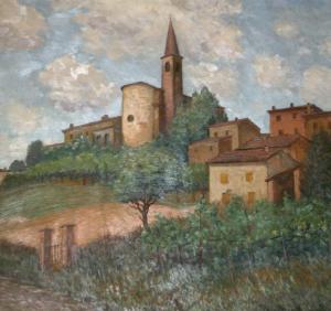 - NOTIZIE STORICO CRITICHE Il dipinto fa parte di un insieme di sei tele (tutte con scorci di Pavia e Provincia), racchiuse entro una sottile cornice in legno dorato, inserite in una cornice in marmo rosa. Le sei tele costituiscono le sovrapporte che decorano altrettante porte in legno (che si aprono nello stesso ufficio), a listelli orizzonatli in radica, con stipiti e architrave in marmo rosso. \nL'apparato decorativo della stanza, oltre alle porte con cornici marmoree e alle sovrapporte, comprende otto stemmi dipinti sul soffitto e una zoccolatura con rivestimento marmoreo, con lastre di marmo rosso in rilievo sul fondo rosa, a creare una specie di decoro a bugnato e un pavimento a mosaico geometrico. L'insieme si può far risalire alla progettazione degli anni Trenta del Novecento dell'arch. Carlo Morandotti, molto attento alla cura degli interni e non solo alla distribuzione funzionale degli spazi e all'organizzazione formale dei prospetti.