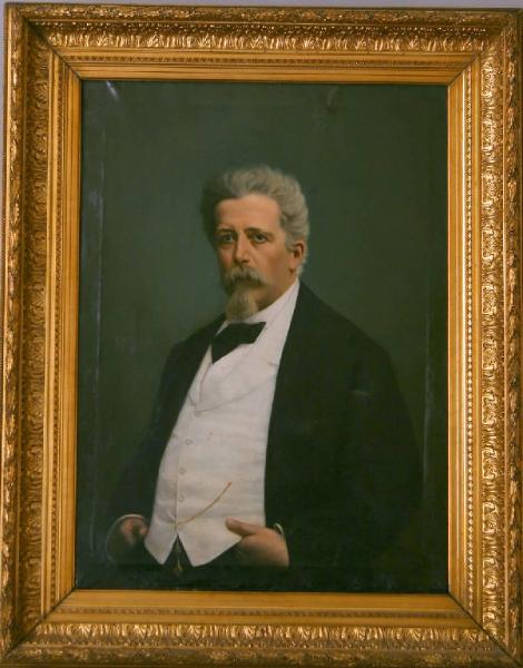 Ritratto di Benedetto Cairoli di tre quarti, con le mani infilate nelle tasche dei pantaloni, abito e cravatta neri e panciotto bianco. Sul panciotto si staglia una catena d'oro con orologio-gioiello.\nIl quadro presenta una cornice in legno dorato decorata da palmette e volute, foglie e bacche d'alloro.