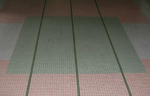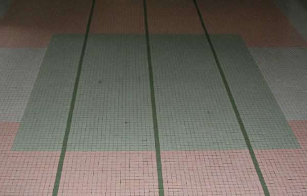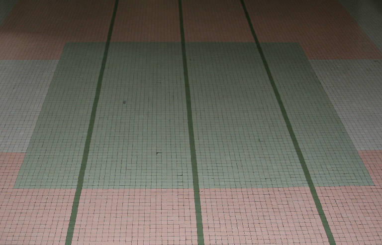 Pavimento a mosaico con tessere bianche, rosa, grigie, verde chiaro e verde scuro, in ceramica: composizione geometrica fatta di linee verticali e grandi quadrati che si intersecano perpendicolarmente su un fondo chiaro.