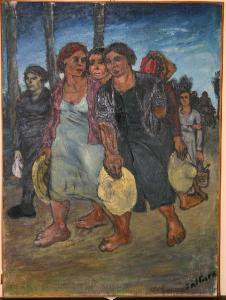 La scena è dominata da massicce figure di contadine ritratte dopo il lavoro: alcune, scalze, tengono in mano cappelli, cesti e fagotti.\nLa tela è racchiusa entro un listello ligneo di un centimetro.