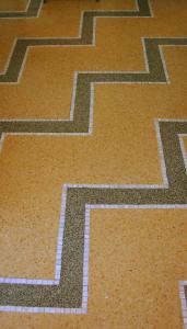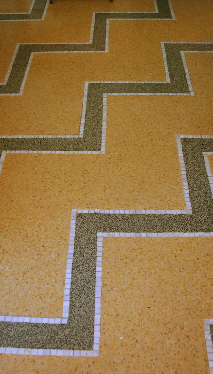 Pavimento eseguito con tecnica mista: seminato veneziano e tessere di mosaico, a disegno geometrico (greche e motivo a zig e zig) nei colori giallo, verde, nero, bianco e rosso, con doppia fascia a mosaico nera che comprende una fascia rossa e con bordura perimetrale verde.