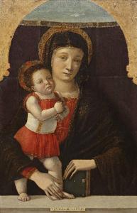 - NOTIZIE STORICO CRITICHE Dai cataloghi manoscritti delle raccolte di Luigi Malaspina di Sannazzaro (Pavia 1754-Milano 1835) si desume che la tavola, acquistata dal marchese prima del 1832, era in origine custodita in casa Manin a Venezia. Il nobile pavese, dilettante d'architettura, tra il 1820 e il 1835 progetta lo Stabilimento di Belle Arti Malaspina, in piazza Petrarca (già del Brolio, poi di Loreto), attiguo alla sua abitazione e destinato ad ospitare le pregevoli collezioni d'arte, che saranno in seguito legate, con testamento del 3 giugno 1833, al pubblico beneficio. Con l'inaugurazione dello Stabilimento il 12 giugno 1838 (Malaspina muore il 28 marzo 1835), il Comune darà vita al primo museo cittadino. Trafugata nella notte tra il 10 e l'11 maggio 1970, l'opera nel 1974 viene recuperata priva di cornice dal Nucleo dei Carabinieri per la Tutela del Patrimonio Culturale e restituito ai musei pavesi nel medesimo anno. Dal 1980 è esposto nel castello visconteo nella sezione della Pinacoteca Malaspina. Il dipinto, ritenuto un originale di Giovanni Bellini, viene in seguito fatto oggetto di riserve in merito all'autografia, nonostante la presenza dell'iscrizione "IOANNES BELLINVS P" dipinta sul cartiglio al centro del davanzale. Assegnato dal Morelli a Bartolomeo Vivarini, successivamente è considerato dal Venturi e dal Testi opera di un seguace, ritenendo apocrifa la firma. Più recentemente Heinemann lo attribuisce, con riserva, a Lazzaro Bastiani, ipotizzando anche che si tratti di un falso ottocentesco o di un pesante restauro integrativo, con la motivazione che la resa del manto a fitti puntini dorati (che il Peroni in realtà scorge anche nella Madonna del Poldi Pezzoli), il velo bianco pieghettato sotto il copricapo della Madonna, il braccio del Bambino 'gonfiato' sono stilemi lontani dalla maniera del Bellini. Nel lungo elenco di studiosi che si sono occupati al dipinto, gli assertori dell'autografia sono però la grande maggioranza: la tavola è infatti ritenuta autentica dal Frizzoni e da Cavalcaselle che la collocano in un periodo giovanile riconoscendovi i modi della pittura del padre Jacopo, dei Vivarini e di Mantegna; quindi dal Gronau; dal Berenson; dal Gamba che la reputa l'opera più antica dell'artista e dal Pallucchini che la considera precedente ai noti polittici dipinti (1462-1464) per la Scuola della Carità a Venezia (ora nella Galleria dell'Accademia), che una parte della critica gli nega. A confermare l'ipotesi attributiva a Bellini depongono, in particolare, elementi stilistici mutuati dalla cultura tardo gotica paterna, specialmente nella colorazione scura del fondo, e influssi mantegneschi evidenti sia nei panneggi "scheggiati e accartocciati" della veste del Gesù Bambino che nel velo della Vergine aderente al viso. Avanzando confronti con alcune opere del catalogo il Bellini, la critica è incline a considerare il dipinto pavese un'opera degli esordi, vicina sia alla "Trasfigurazione" del Museo Correr di Venezia (già ascritta ad Andrea Mantegna) come sembrano suggerire il modellato un po' legnoso, la spigolosità della canna nasale e delle guance della Vergine, la resa dei riccioli del Bambino, sia alla Madonna Devis del Metropolitan Museum di New York (collezione Lehman), evidenziando la stessa tipologia di veste del piccolo Gesù. I dati stilistici farebbero quindi propendere per una cronologia attorno al 1445. Francesco Mori in base al confronto stilistico, colloca la Madonna del Bellini tra le miniature della Passio Sancti Mauritii della Bibliothèque dell'Arsenal di Parigi (1453) e quelle dello Strabone di Albi (1459): "Nelle illustrazioni del primo codice l'influenza mantegnesca non pare infatti ancora pienamente assimilata, mentre sono presenti reminiscenze tardogotiche alla Jacopo Bellini. Nel secondo manoscritto i colori si fanno più lucenti e brillanti e l'influsso del Mantegna pare già elaborato. Si potrebbe perciò confermare una cronologia oscillante attorno al 1455". Alcune perplessità, per altro già espresse dal Pallucchini nel 1959, desta la natura posticcia del drappo semicircolare che conclude superiormente il dipinto: la piattezza della campitura nera che, inoltre, presenta una crettatura diversa, la diversità dei motivi dipinti a oro sui risvolti della tendaggio rispetto a quelli presenti nei bordi delle maniche e sul velo della Vergine, sembrano confermare questo sospetto. L'intervento potrebbe essere stato realizzato per mascherare le tracce dovuta all'asportazione di una perduta centinatura.