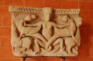 Capitello di pilastro rettangolare recante al centro una figura virile nuda, coronata, scolpita ad altorilievo, con ventre prominente, ombelico e costole ben delineate, gambe divaricate e braccia aperte ad afferrare il collo di due poderosi draghi alati, con occhi a globo, le cui lunghe code squamate si intrecciano avvinghiate simmetricamente attorno alle gambe e ai piedi dell'uomo seduto. I due mostri a loro volta si appoggiano ai fianchi di due leoni semi rampanti, dal lungo collo segnato da una criniera solcata da ciuffi desinenti in riccioli e la coda tra le zampe, disposti ai due angoli del capitello. Nell'abaco una greca a traforo con rettangoli sfalsati, eseguita a scalpello, che sembra continuare, in dimensioni minori, sulla corona del personaggio centrale, dando risalto alla testa. Sul lato breve di destra è conservata un'altra figura mostruosa alata, con corpo di serpente percorso da squame a forma di perla.