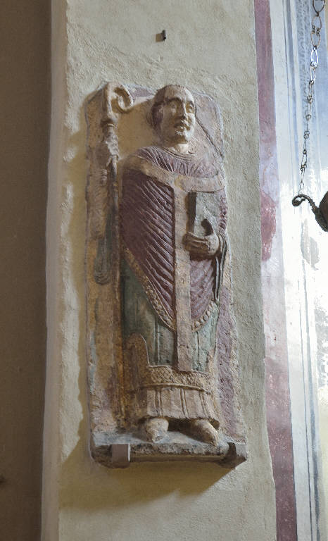 - NOTIZIE STORICO CRITICHE Il prezioso manufatto di età romanica rappresenta la più antica e nota figurazione di S. Siro, primo vescovo e patrono della città di Pavia (283-339). Il rilievo, è custodito nella chiesa dei SS. Gervasio e Protasio, identificata come la prima basilica cristiana fondata a Pavia nel IV secolo, come cattedrale extraurbana, dal S. Siro stesso, il protovesco che qui ebbe la sua prima sepoltura. Nel 1330 Opicino de Canistris definisce la chiesa dei SS. Gervasio e Protasio "que fuit prima ecclesia ticinensis". Tra l'830 e l'841 il corpo del Santo viene traslato da una chiesa ritenuta non sicura in quanto edificata in campagna fuori dalla cinta muraria alla nuova cattedrale gemina di S. Stefano e S. Maria del Popolo per opera del vescovo Adeodato (830-841). L'episodio viene narrato nella "Translatio", testo, privo di riferimenti cronologici, steso verosimilmente da un contemporaneo all'evento che Prelini identifica con il monaco Dungallo (monaco irlandese a cui Lotario 1º nell'825 affidava una scuola per l'istruzione del clero). Nello scritto è ricordato che la salma, avvolta in un lenzuolo, viene esposta per ventiquattro giorni nella basilica invernale (S. Maria del Popolo), mentre si provvedeva ad approntare un luogo idoneo in cui riporla nell'adiacente cattedrale estiva di S. Stefano. Nel 1875 l'erudito sacerdote pavese Cesare Prelini scopre, incise su una pietra inserita nella pavimentazione della chiesa, le lettere SVRVS EPC (Siro vescovo). Questo blocco di granito inscritto ed un altro complementare, utilizzati come soglia nelle prime cappelle laterali, facevano parte in origine di un sarcofago identificato come prima sepoltura di S. Siro. In occasione di questo rinvenimento Prelini, sulla scorta di due testi del Breventano e del Mezzadri, recupera anche, immurato nel convento francescano adiacente alla chiesa, il bassorilievo policromo del santo, in origine posizionato in facciata. Bernardo Sacco nella seconda metà del XVI secolo lo vede ancora in facciata, mentre il Mezzadri nel 1729 lo descrive già all'interno del convento (a partire dal 1712 la chiesa cambia orientamento, distruggendo la facciata disposta in origine ad occidente). Tra il 1875 e il 1887, viene quindi creata un'apposita cappella, la seconda a sinistra, intitolata in quell'occasione a S. Siro, nella quale vengono raccolti tutti i cimeli conservati nella chiesa legati alla figura del Protovescovo e Patrono di Pavia. Un semplice altare "a mensa" su quattro colonnine viene disegnato da Cesare Dagna per ospitare, inferiormente, il prezioso avello con la più antica sepoltura di S. Siro. Nel sacello vengono posizionati anche un cippo esagonale lipsanoforo (cioè custodia di reliquie di santi entro un apposito vano a forma di clessidra) in marmo bianco di Ossola; due semicapitelli corinzi romanici; la cinquecentesca pala d'altare con S. Siro (ora in canonica), nella piccola nicchia a parete protetta da inferriata una sola reliquia del Santo con quelle dei SS. Gervasio e Protasio e il rilievo policromo del vescovo pavese che viene murato nel piedritto sinistro dell'arco d'accesso alla cappella. La cappella, a pianta rettangolare coperta da volta a botte e illuminata da un'ampia finestra termale a lunetta, viene fatta costruire "dalle fondamenta" da Marco Antonio Giorgi nel 1591 e dedicata alla Beata Vergine delle Grazie e della Consolazione, come testimoniano i documenti e la lapide addossata al piedritto destro. Tale cappella, dipendente dal patronato della famiglia Giorgi, sarà all'inizio del Settecento intitolata a S. Giovanni Battista, quindi a S. Giuseppe.Taluna critica (Porter, Panazza) è concorde a datare il rilievo di S. Siro al XII sec., mentre altra (Gianani) all'inizio del XIII sec., l'ascrizione agli ultimi decenni del XII sec. legherebbe il bassorilievo alla ricostruzione tardo romanica della basilica ad aula unica.A Pavia si conservano altri quattro bassorilievi della metà del XII sec., raffiguranti vescovi, privi di iscrizioni e di attributi identificativi. In S. Michele i SS. Ennodio ed Eleucadio in facciata sopra i portali laterali; S. Nicola e S. Ennodio entro due clipei nell'architrave dell'ingresso nord; un vescovo non identificato in un'arcata del transetto nord. Ai Musei Civici, ma proveniente dalla facciata della distrutta chiesa romanica di S. Giovanni in Borgo, è esposta una figura a mezzo rilievo in un blocco rettangolare poggiante su un soppedaneo, di alta qualità, dalla quale, per Mazzilli, il rilievo di S. Siro riprenderebbe le dimensioni e l'iconografia (identica la perlinatura della bordura della dalmatica), con la sola variante del libro al posto del gesto benedicente alla greca. A proposito del quale Peroni vede 'la fedeltà a schemi iconografici di antica tradizione, per cui a reminiscenze della statuaria provinciale tardo-antica, mantenute vive dalla plastica in stucco, si associano puntigli descrittivi nella veste pontificale, alla loro volta rievocanti l'intaglio in avorio, sino a risalire ai dittici consolari'.