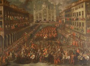 Ingresso del corteo di Eugenio di Savoia in Piazza del Duomo. Arrivo trionfale del corteo del Principe Eugenio di Savoia a Milano in piazza Duomo