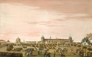 - NOTIZIE STORICO CRITICHE Le celebrazioni per la pace di Luneville e per la posa della prima pietra del Foro Bonaparte si svolgono nella piazza antistante il Castello Sforzesco, in gran parte liberata dai terrapieni dei bastioni spagnoli; nella piazza, monumenti allegorici temporanei. Davanti ad essi sfilano milizie. Il pubblico assiste da terrapieni del Castello e da tribune. In primo piano a destra lo scavo per la prima pietra.