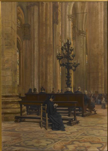 In primo piano panche con devoti. Sullo sfondo il Candelabro Trivulzio e piloni del Duomo