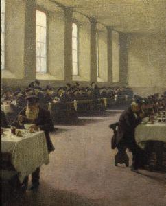 Il refettorio del Pio Albergo Trivulzio. Il refettorio dei vecchioni. Interno del refettorio del Pio Albergo Trivulzio durante un pasto