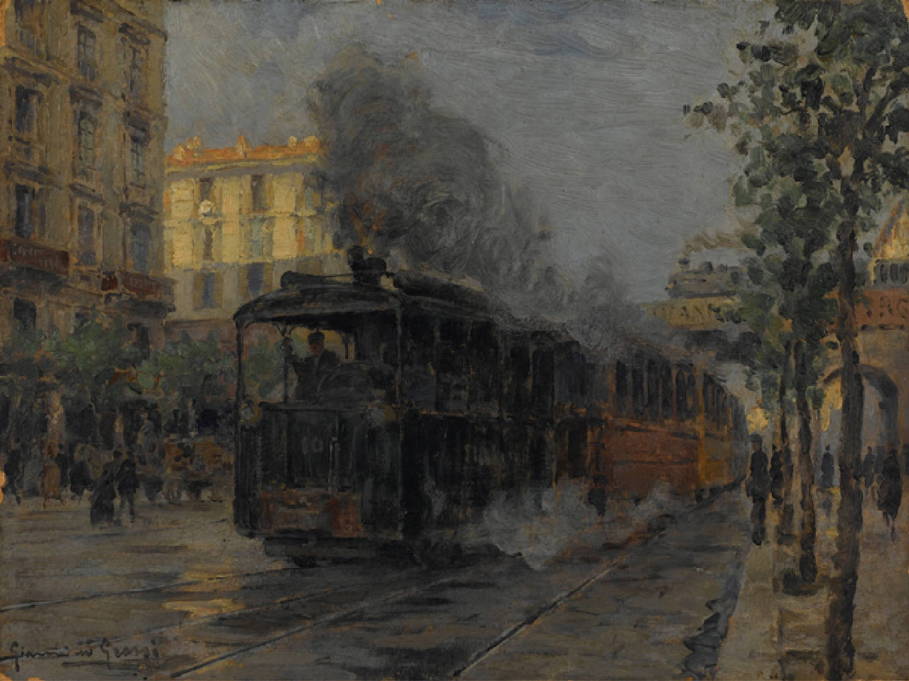 Corso Buenos Aires col vecchio tram a vapore. Corso Buenos Aires a Milano con passaggio del tram a vapore