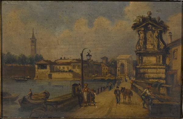 Porta Ticinese vista dal ponte del Trofeo. Porta Ticinese col monumento della Torretta nell'anno 1859. Porta Tcicinese a Milano e il ponte del Trofeo nel 1859