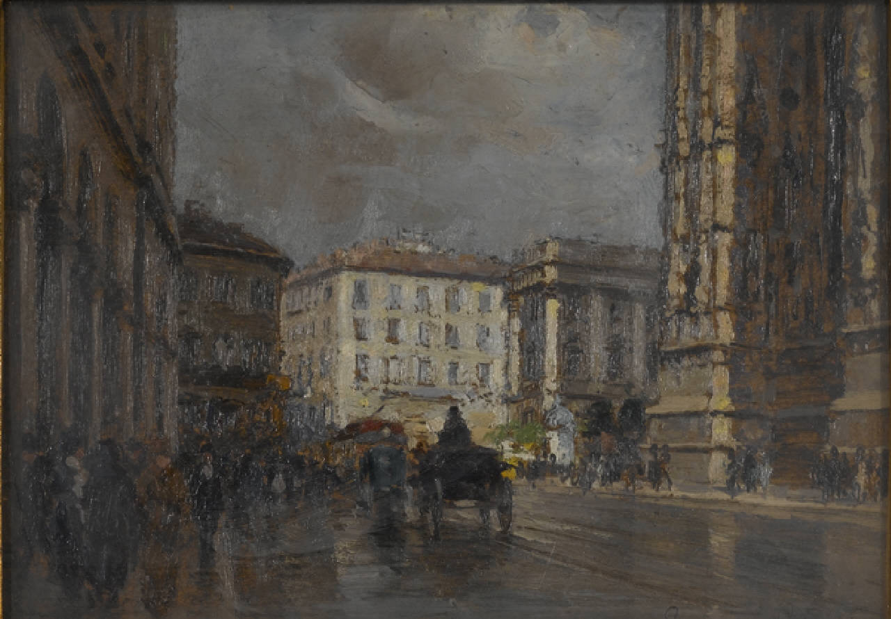 Piazza del Duomo. Duomo, il fianco sinistro verso Camposanto. Piazza del Duomo a Milano fra i portici settentrionalie il lato ovest della cattedrale