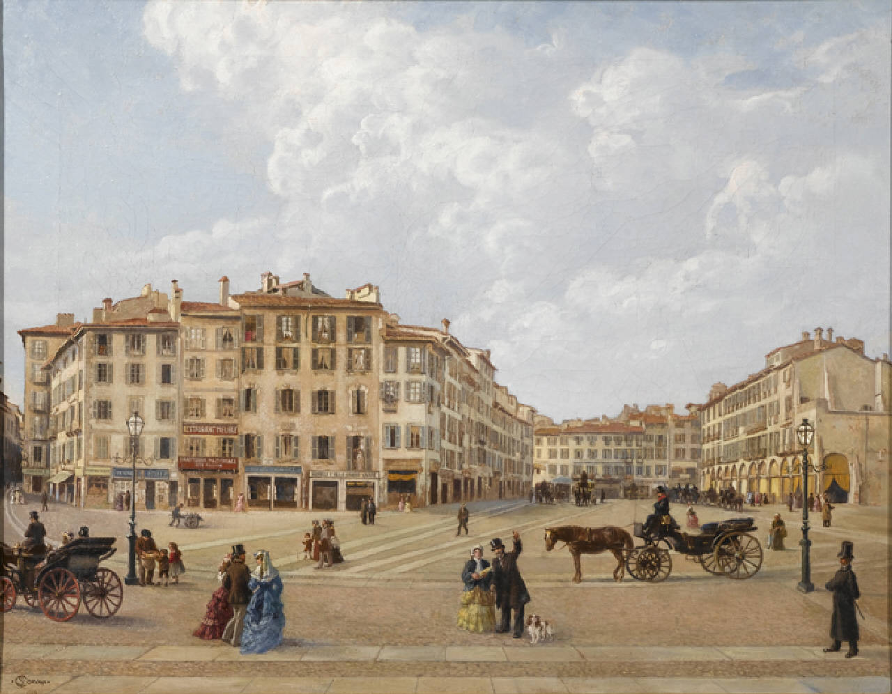 La Piazza del Duomo nel 1862 da vecchia fotografia. Piazza del Duomo a Milano, da una fotografia del 1862, vista dai gradini della cattedrale