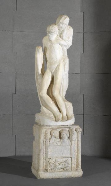 - NOTIZIE STORICO CRITICHE La "Pietà Rondanini" compare nell'inventario dei beni lasciati da Michelangelo, redatto alla sua morte, il 18 febbraio 1564, nella dimora romana. Michelangelo negli ultimi giorni della sua esistenza era impegnato nella realizzazione dell'opera. L'opera riemerge dall'oblio solo nel 1807, quando viene stilato l'elenco dei beni della famiglia romana dei Rondinini, in via del Corso. Giuseppe Rondinini, figlio del marchese Alessandro, raffinato collezionista e appassionato di scultura, si era spento senza eredi nel 1801. La sua collezione comprendeva oltre duecento sculture, molte delle quali recavano la sigla M.G.R. (marchese Giuseppe Rondinini), la medesima che compare sul basamento della "Pietà". L'eredità è assegnata al marchese Giuliano Capranica e comprende, tra i beni di via del Corso, la "Pietà". Il compilatore dell'inventario la definisce opera erroneamente attribuita a Michelangelo Buonarroti. Nel 1904 il palazzo viene acquistato dal conte Roberto Sanseverino Vimercati. Il gruppo, in quegli stessi anni, viene notificato, come opera di particolare interesse per il patrimonio nazionale, da parte dello Stato. In occasione della vendita del palazzo, il Ministero competente che avrebbe avuto diritto di prelazione a seguito della notifica, ne rifiuta l'acquisto. L'opera viene trasferita nella villa del figlio del conte Roberto, Ottavio, nei pressi di Roma. Il marmo viene infine collocato in un villino di via Nerola, dove ne viene permessa la visita a orari stabiliti. Gli eredi del conti decidono di vendere l'opera, prima attraverso un'asta giudiziaria e, successivamente, con trattativa privata. Il mandato di vendita viene affidato a Ettore Sestieri con un incarico della durata di sei anni. Inizia la corrispondenza con la Soprintendente di Brera, Fernanda Wittgens, che avvia una raccolta di fondi con la collaborazione della Banca Commerciale Italiana. Con l'intervento del sindaco di Milano, Virglio Ferrari, l'opera viene assicurata alla città. La destinazione dell'opera alle collezioni civiche del Castello suscita la reazione risentita della Soprintendenza che rivendica la "Pietà" per le collezioni di Brera. L'opera giunge a Milano presso la Direzione delle Civiche Raccolte d'Arte il 30 ottobre 1952. La datazione della prima versione della "Pietà Rondanini", quella a cui appartengono il braccio mutilo e, in parte, le gambe di Cristo, va collocata tra il 1552-1553 e il 1555. Dopo il 1555 Michelangelo riprende il lavoro su questo marmo, che, nel 1561, regala al suo servitore. Una terza fase di rielaborazione, secondo la testimonianza dell'amico e collaboratore Daniele da Volterra, va collocata alla fine della vita dell'artista a testimonianza della lunga e tormentata genesi della "Pietà Rondanini". Il motivo iconografico del corpo di Cristo in posizione verticale deriva dalla tavola realizzata nel 1501 per la Chiesa di S. Agostino a Roma ed oggi alla National Gallery di Londra. Secondo Panofsky (1927) l'iconografia si ispira alla scultura lignea d'Oltralpe. Nell'inventario ottocentesco l'opera viene definita "deposizione dalla Croce" a testimoniare il complesso problema iconografico posto dalla "Pietà Rondanini". La posizione elevata della figura della Madonna, collocata su un blocco di pietra oltre il quale il corpo senza vita del Figlio sembra scivolare, ha indotto a pensare che si trattasse di una deposizione nel sepolcro. Tra i disegni preparatori del modello è individuato un foglio di schizzi oggi a Oxford. Altri disegni testimoniano quanto il tema della "Pietà" fosse presente nei pensieri di Michelangelo. Due disegni sono preparati per Sebastiano del Piombo che realizzava un dipinto con la "Pietà" per Ferrante Gonzaga, nel 1533; uno è conservato oggi a casa Buonarroti e l'altro al Louvre. Un disegno con la "Pietà" è composto per l'amica Vittoria Collona e oggi conservato a Boston. Alla prima versione della "Pietà Rondanini" appartengono il braccio destro, l'impostazione della testa della Vergine, orientata verso destra e divergente da quella del Cristo, e le gambe di quest'ultimo, levigate e finite come il braccio superstite. La figura della Madonna, a parte il cambio di orientamento della testa, non deve avere subito altri mutamenti rispetto all'impostazione originaria. Forse iniziava a subire un processo di assottigliamento che la riequilibrasse rispetto alla figura del figlio. Nella nuova versione le braccia del figlio si appoggiano al tronco e alle gambe della madre e la testa è scolpita utilizzando il marmo della spalla destra della Madonna. La testa inoltre era pensata più in alto e più vicino a quella della madre, poi abbassata e assottigliata accentuandone la caduta inerte sul corpo smagrito. La "Pietà Rondanini" nel 1956 viene esposta al Castello Sforzesco nell'allestimento appositamente curato dallo studio BBPR.